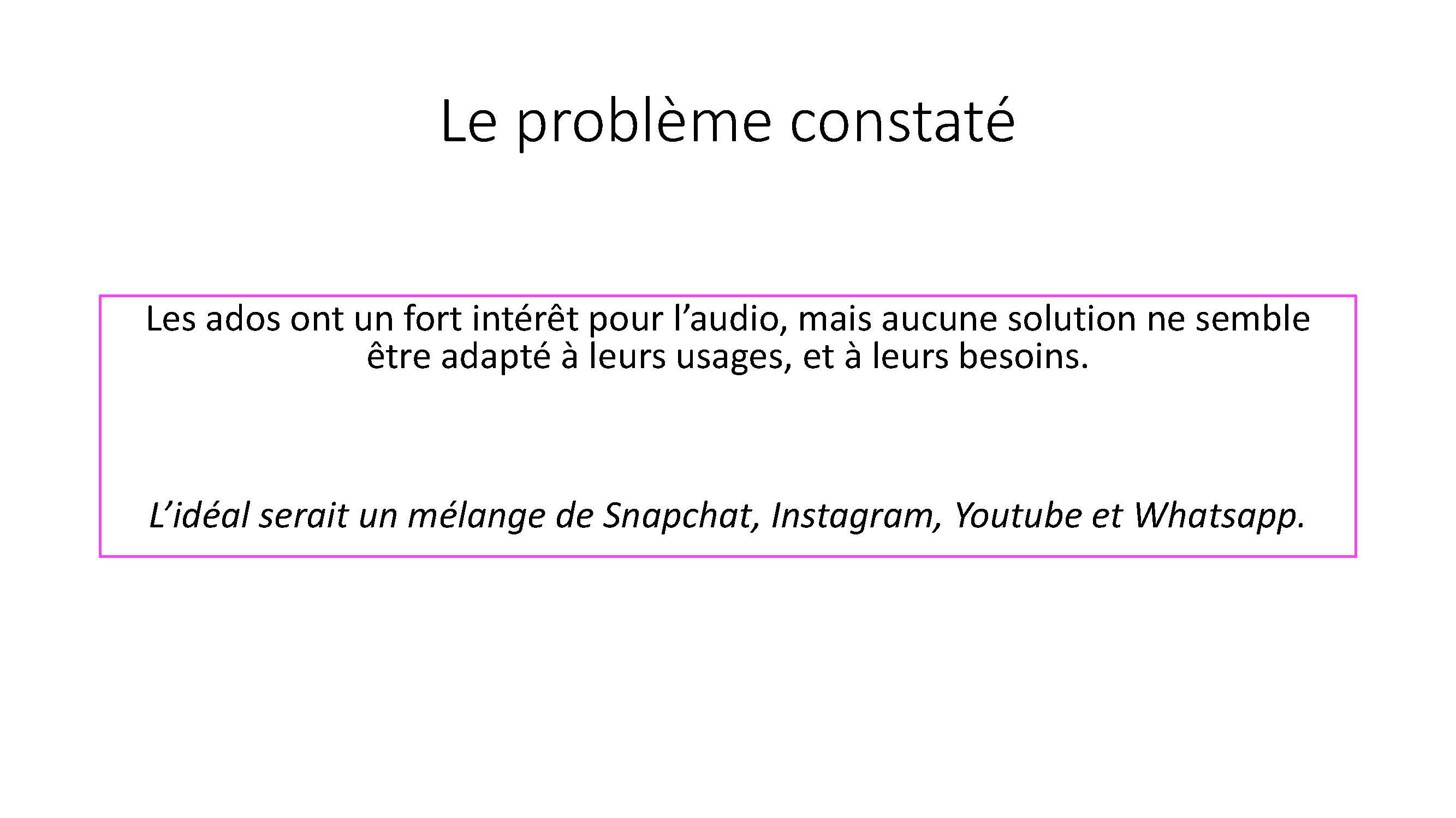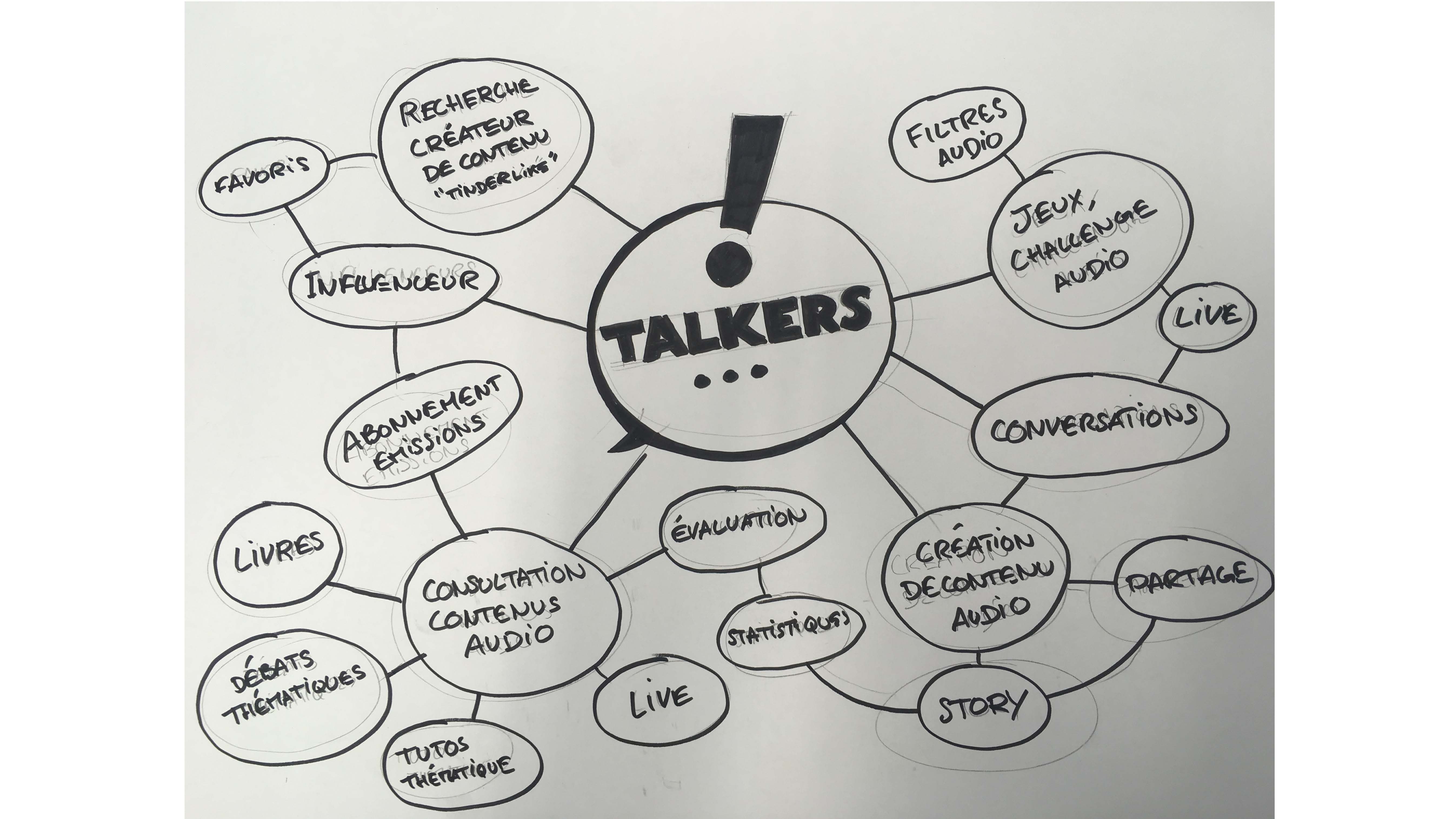 La Startup Talkers nous a consulté car depuis leur création, il y a 1 an et demi, elle fait face à un très mauvais taux de rétention. Nous avons donc cherché à comprendre et interrogé l’équipe Talkers. Le problème majeur qui en est ressorti est un manque de vision sur le produit en lui même. Pas de cible déterminée, pas de positionnement sur le marché, aucune connaissance de la concurrence. La startup voudrait se positionner sur le marché du podcast en tant que réseau social audio.