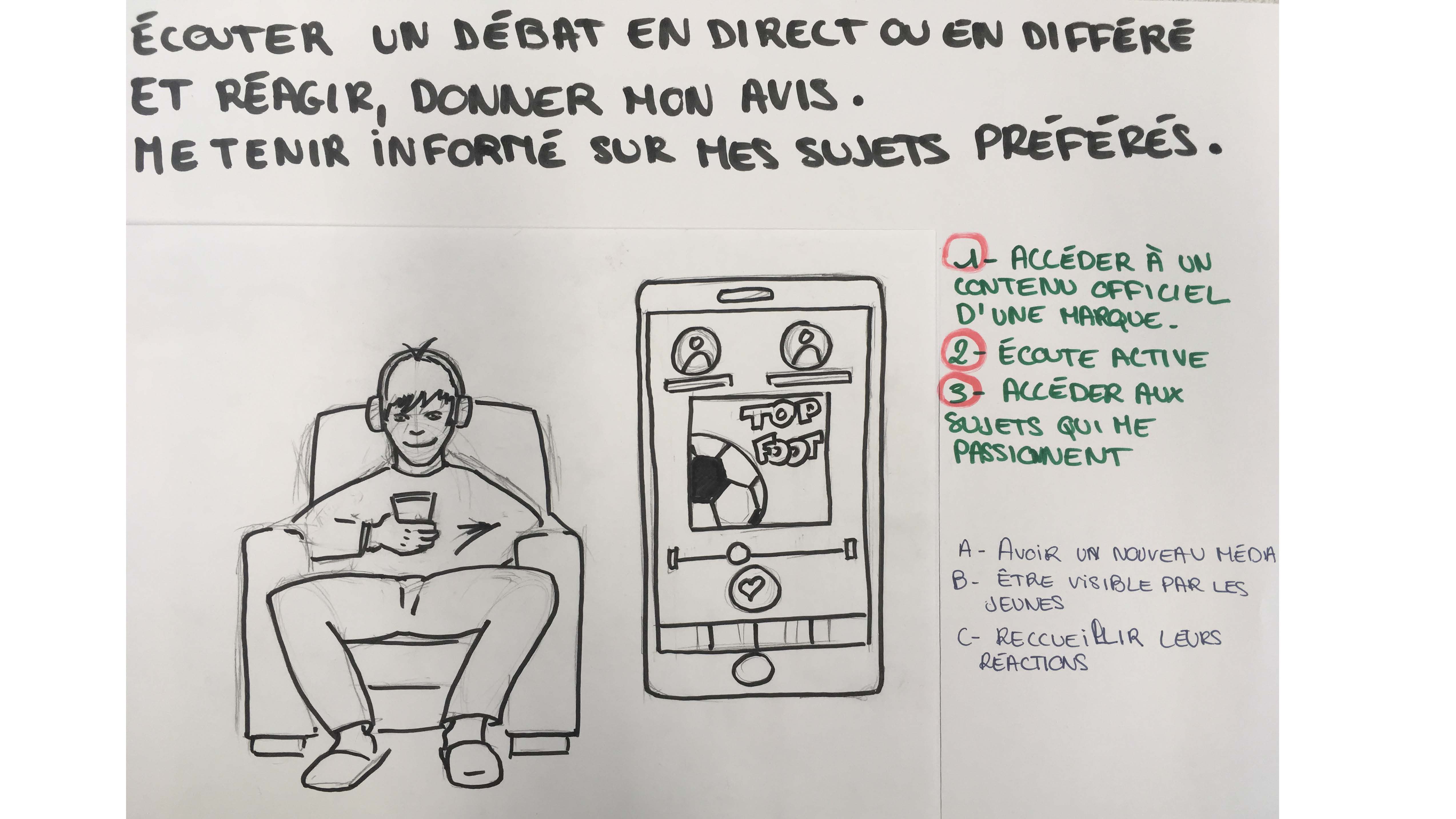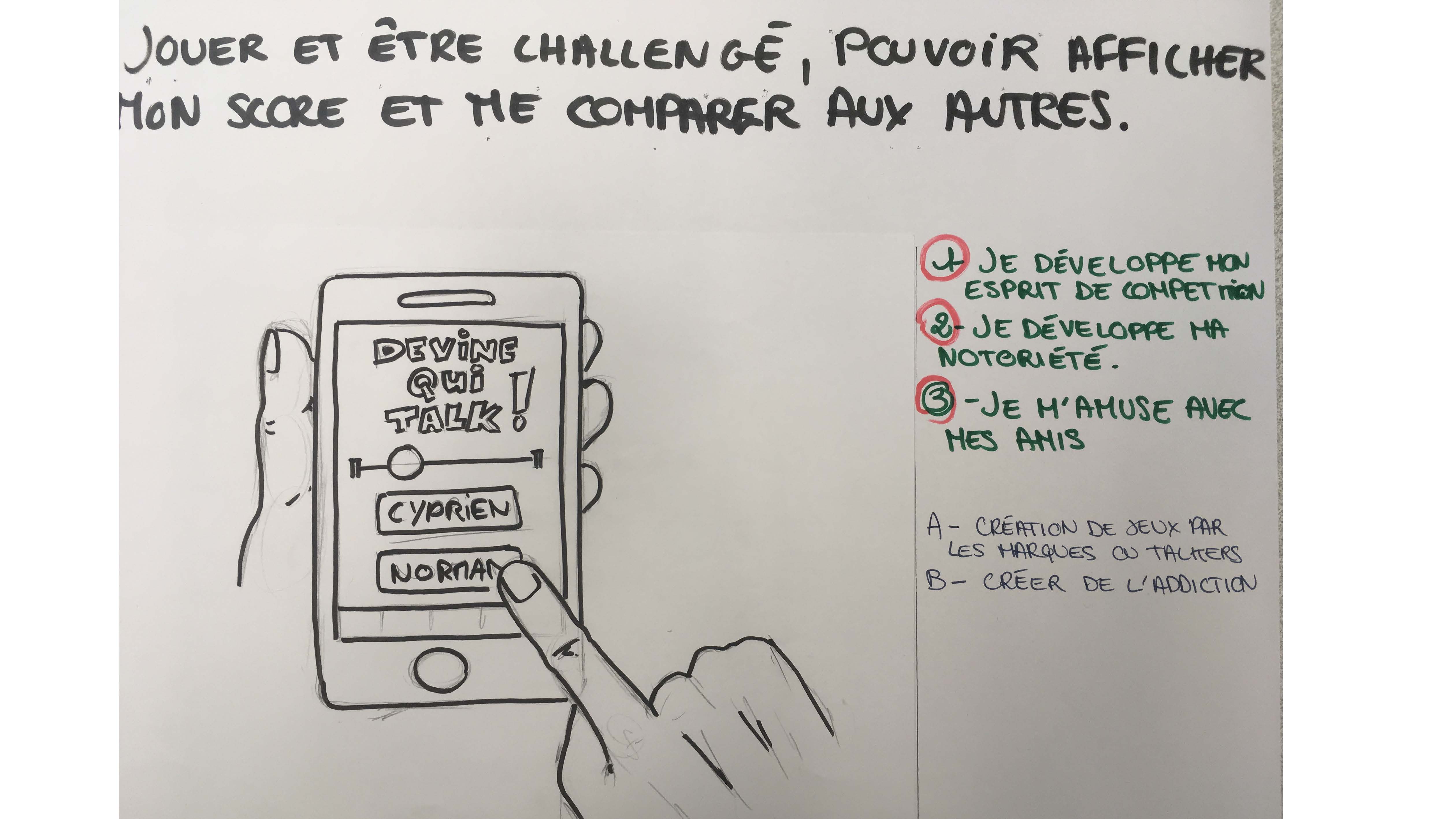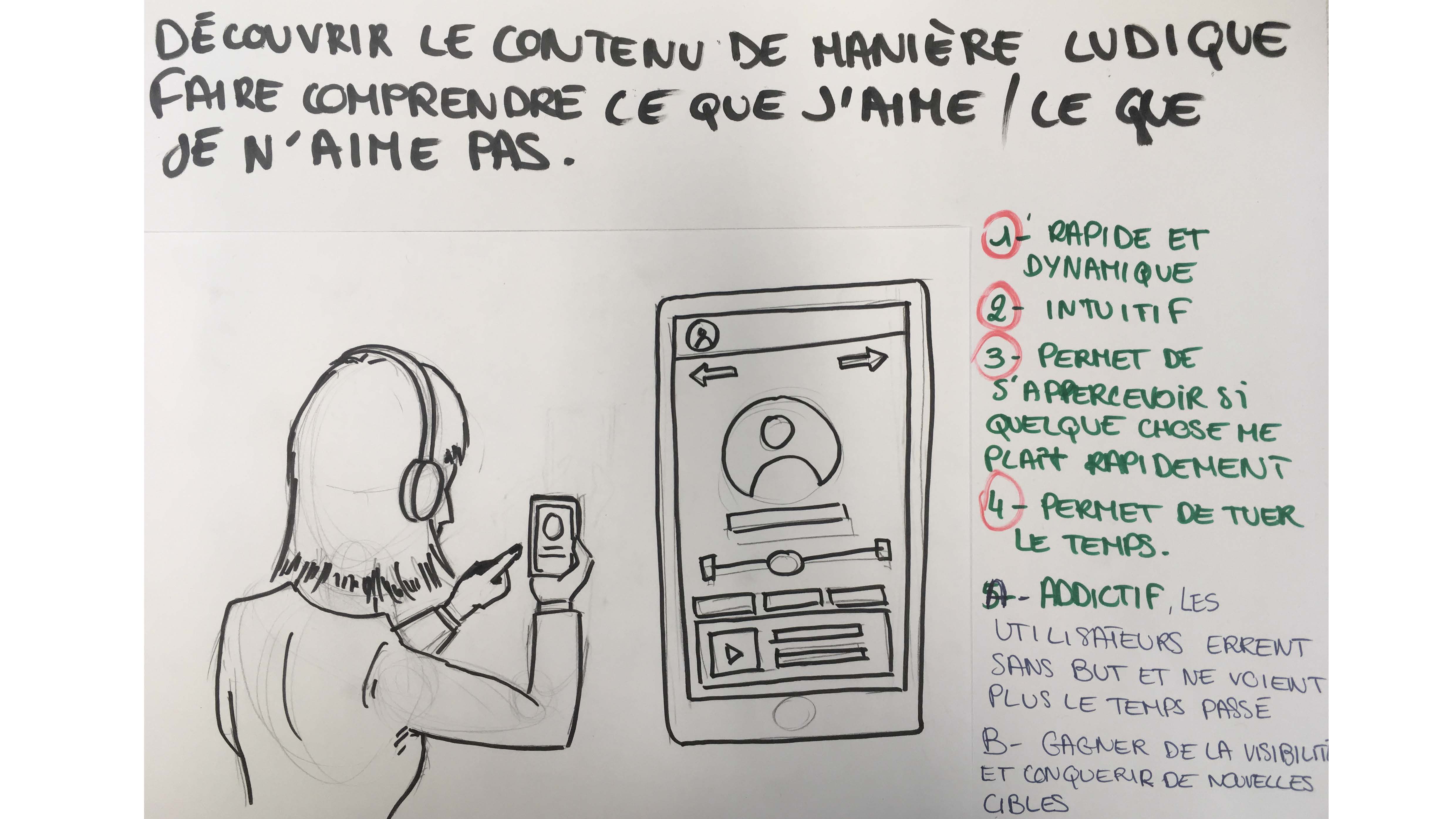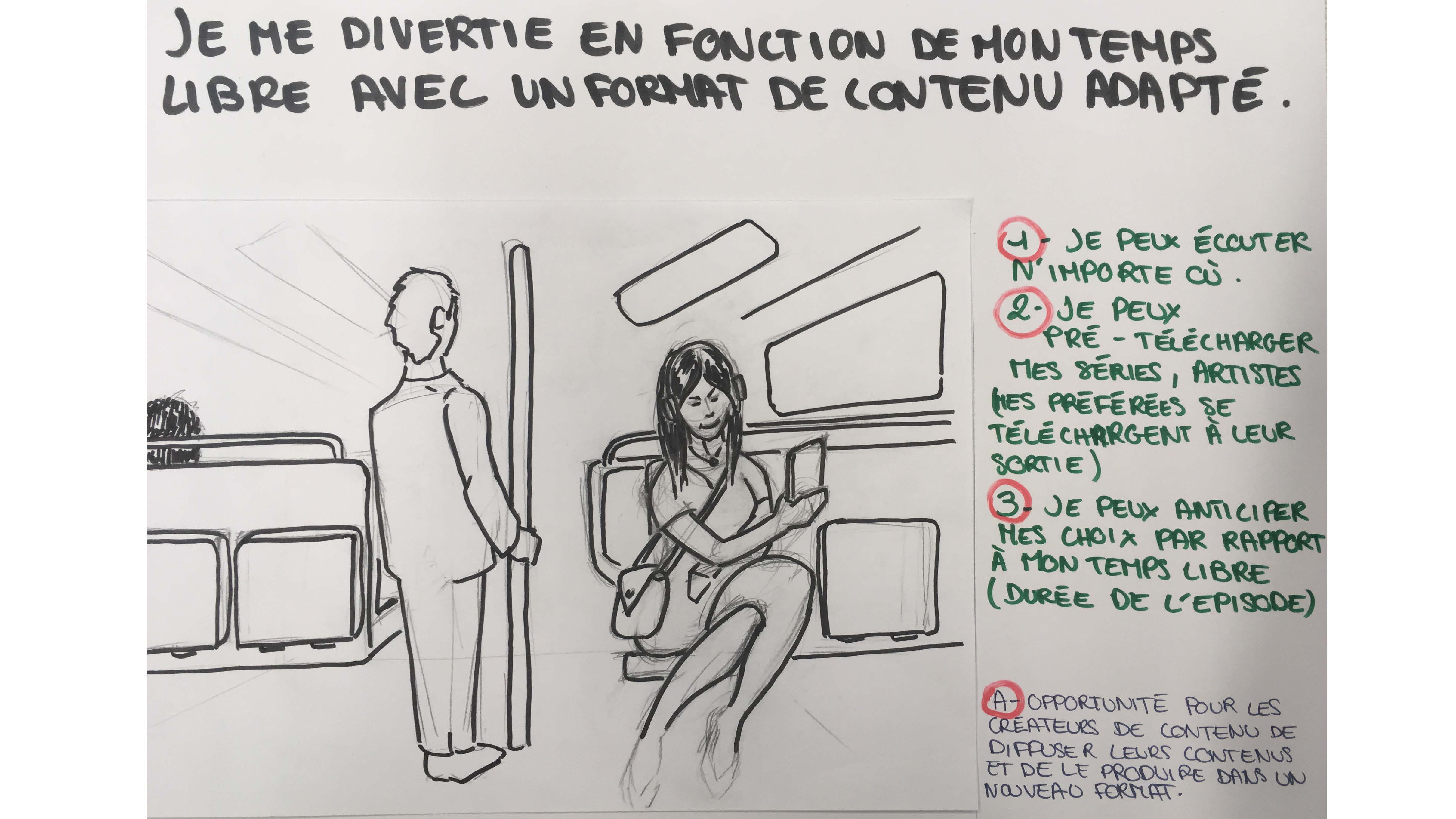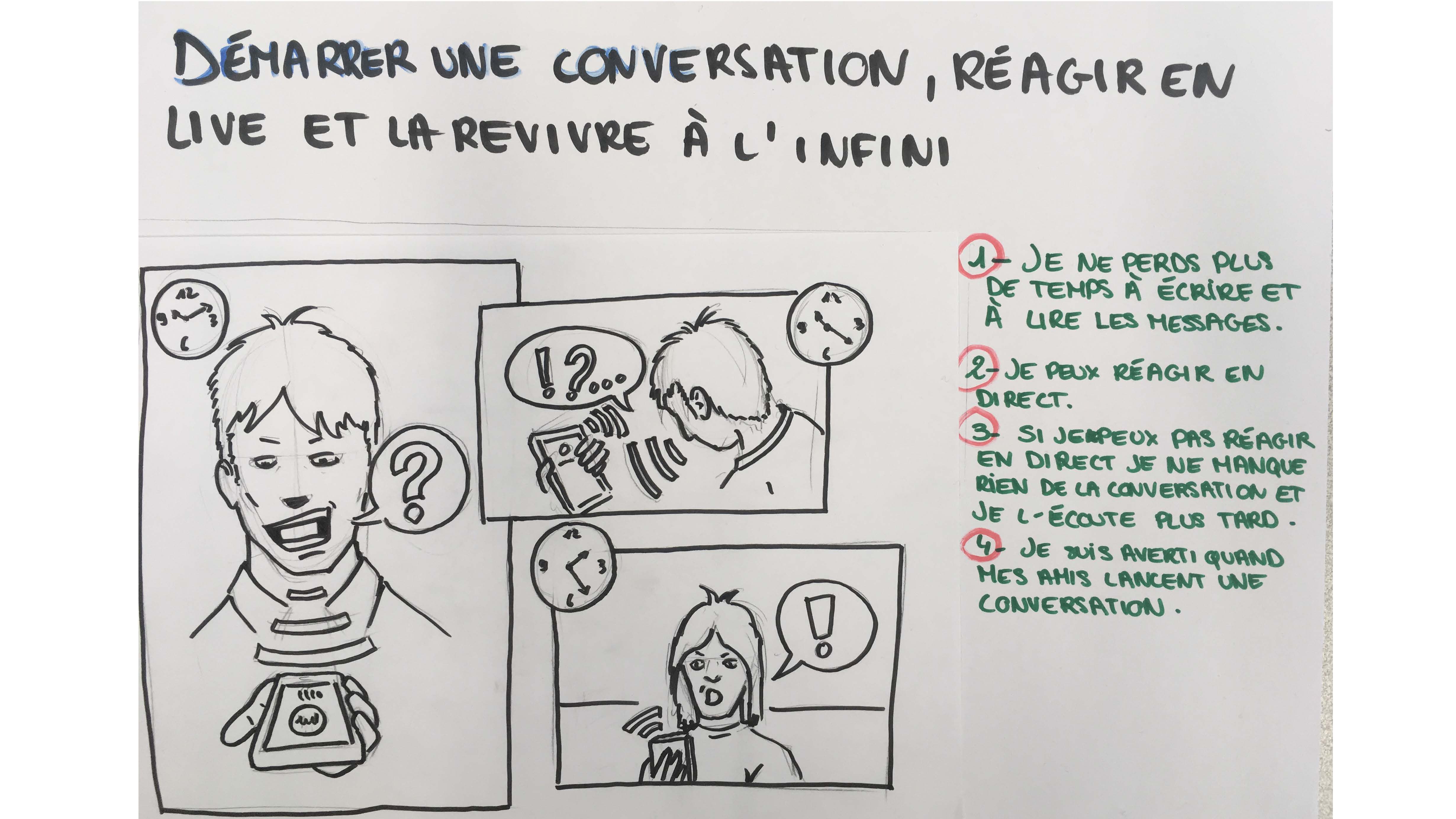 Pendant cette phase nous avons prototypé une vision pour une cible adolescente, addicte aux réseaux sociaux. Nous avons ensuite présenté à la startup des storyboard avec différents cas d’usages et fonctionnalités envisagés.